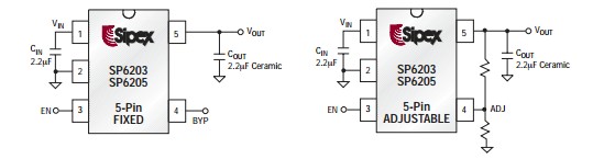 SP6201EM5-1.8 features: (1)Very Low Dropout Voltage: 0.61 PMOS Pass Device; (2)Accurate Output Voltage: 2% over Temperature; (3)Guaranteed 500mA Output Current: SP6205; (4)Ultra Low Noise Output: 12uVRMS with 10nF Bypass; (5)Unconditionally Stable with 2.2uF Ceramic; (6)Low Quiescent Current: 45uA; (7)Very Low Ground Current: 350uA at 500 mA; (8)Power-Saving Shutdown Mode: < 1uA; (9)Fast Turn-On and Turn-Off: 60uS; (10)Fast Transient Response; (11)Current Limit and Thermal Shutdown Protection; (12)Very Good Load/Line Regulation: 0.07/0.04%; (13)Excellent PSRR: 67dB < kHz; (14)Industry Standard SOT-23-5 and Small 8 pin 2X3 DFN Package; (15)Fixed Output Voltages: 2.5V, 2.7V, 2.8V, 2.85V, 3.0V and 3.3V; (16)Adjustable Output Available.